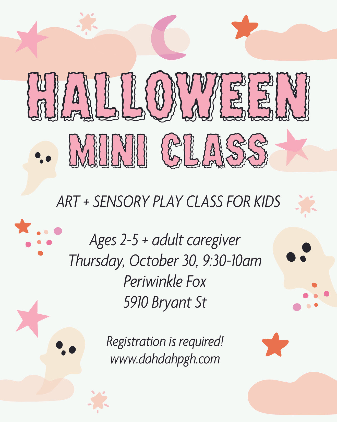 Come join Dah Dah Creative Play for a Halloween Mini Class. The October 30th class at 9:30 am will be held inside and include a custom craft to take home, sensory play and more! Ages 2-6 welcome. Advance sign-up is required. Book your spot online here.